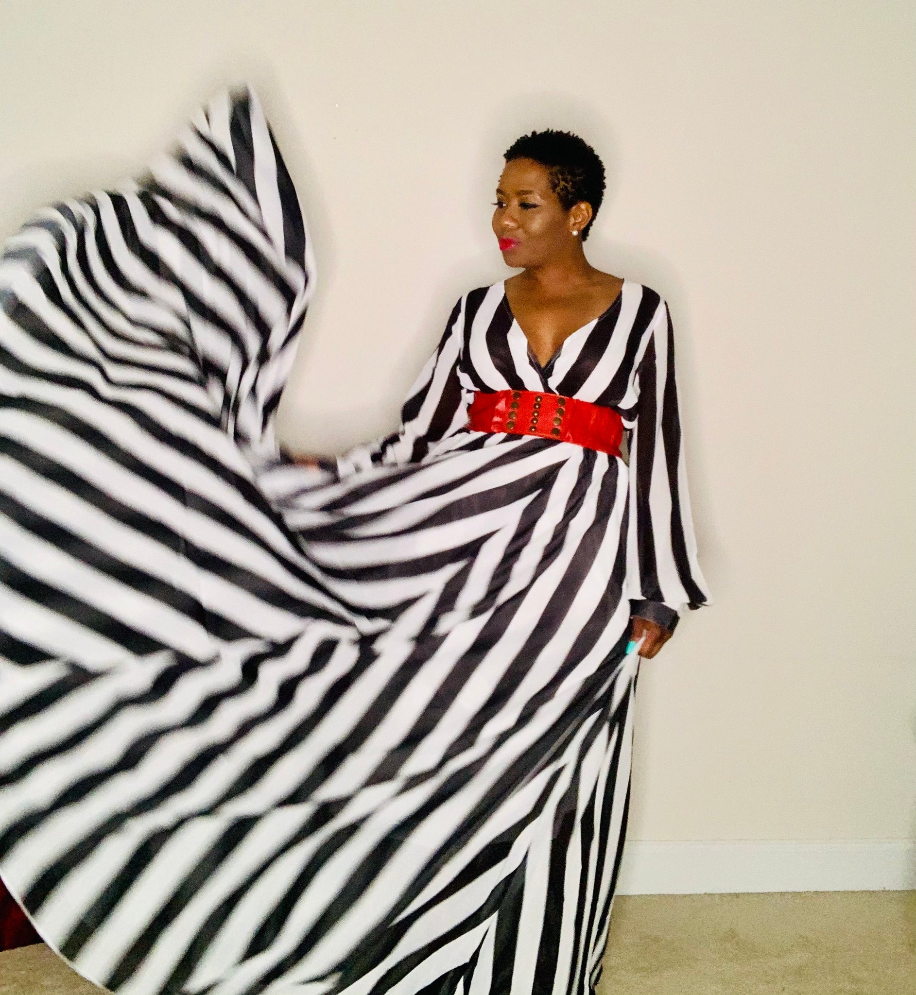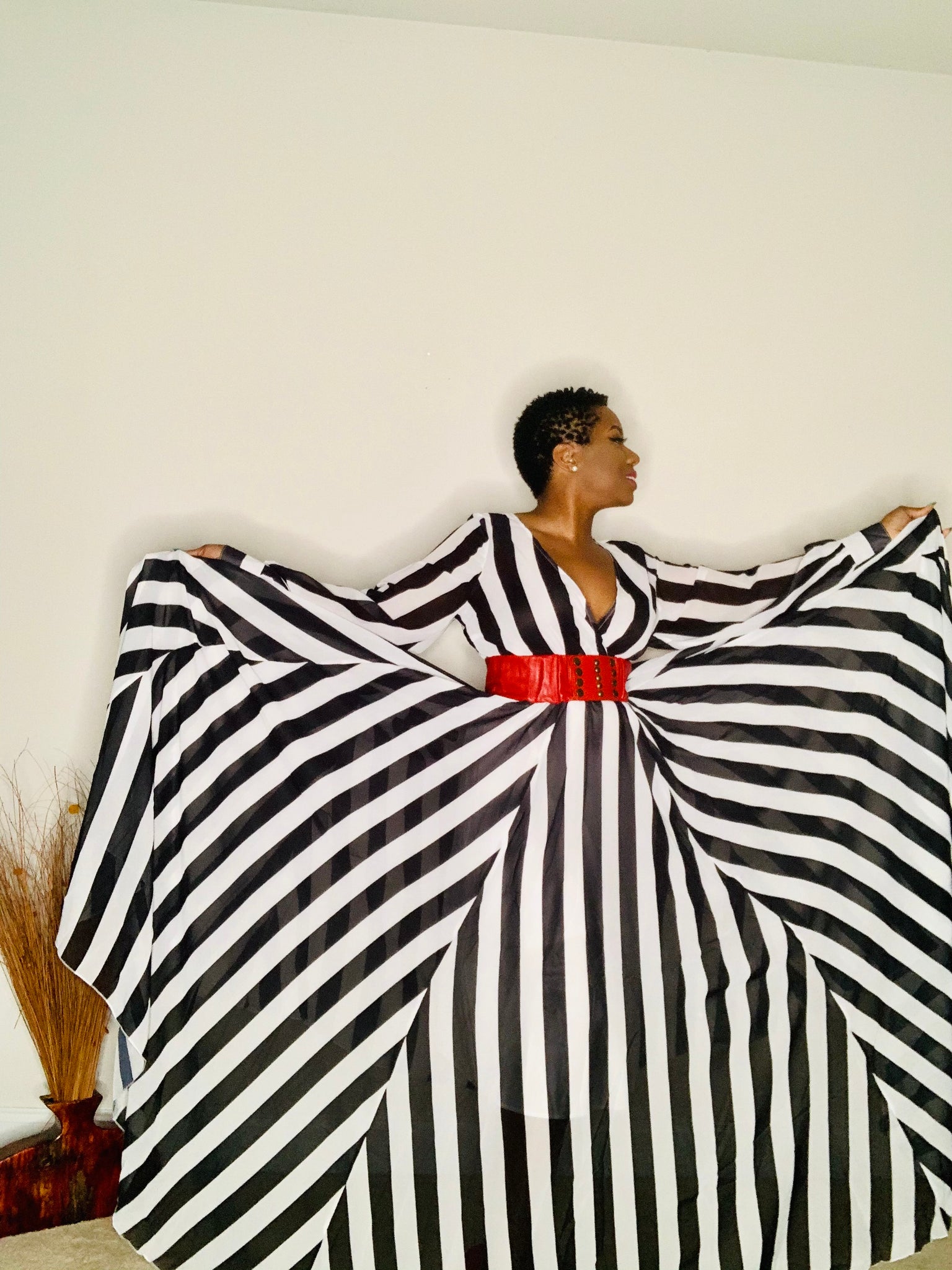 Black and white light weight circle dress with sheer sleeves and button up front.